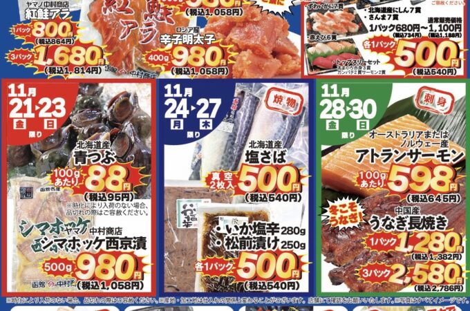海鮮市場です🐟 11月も元気に特売やっていきます❗️ 次の特売は11月7日(金)〜11月16日(日)まで😆 早速、今回のおすすめ商品をご紹介🙌 期間限...