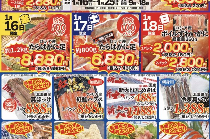 海鮮市場より次回特売のお知らせ📩次回は1月16日(金)〜25日(日)まで❗️年明け掘り出し祭りの開催ですよー‼️ 今回はお得なカニが目白押し🦀🦀 16...