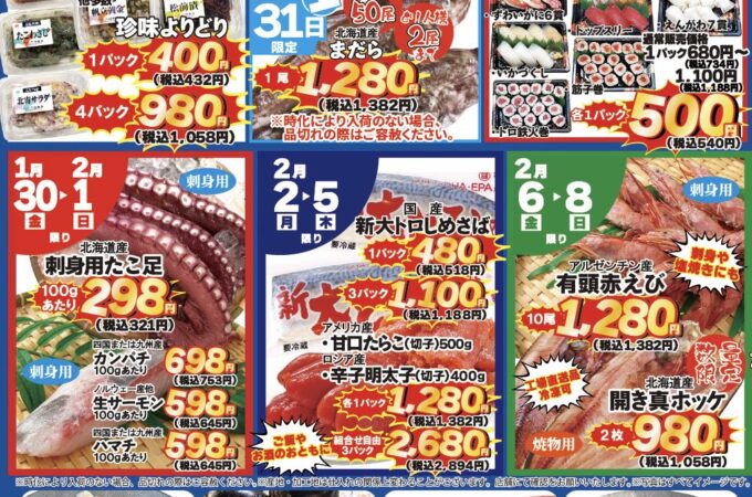 海鮮市場より次回特売のお知らせ📩次回特売期間は1月30日(金)〜2月8日(日)まで❗️ 早速目玉商品をご紹介💁♀️ まず期間限定第1弾は、北海道産刺...