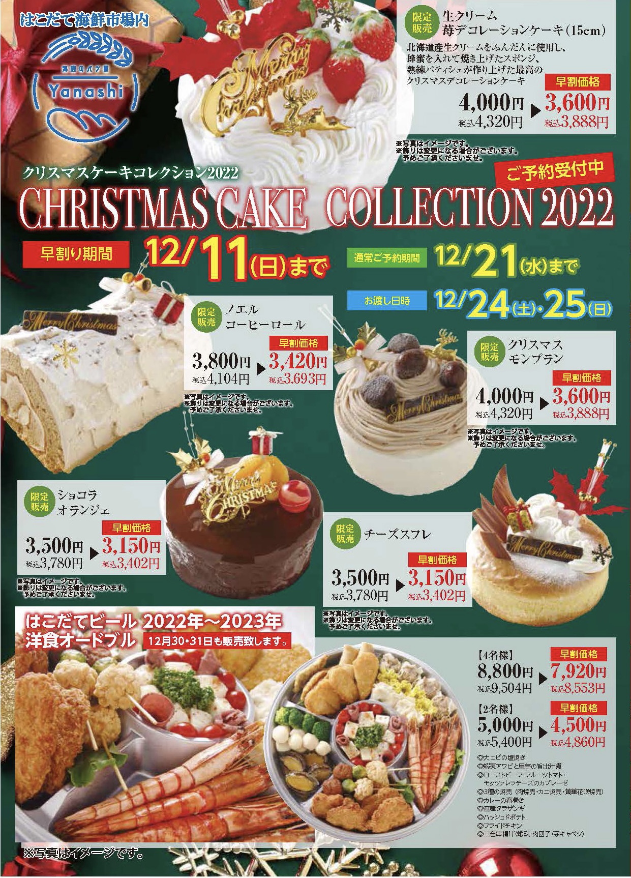 パティシエ自慢のケーキ今年は5種類!迷っちゃいますね😁はこだてビールの洋食オードブルもご予約可能です👏