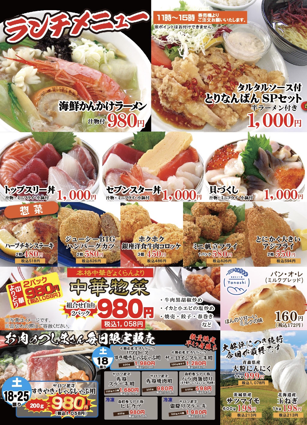 その他、新鮮なお魚・野菜・お肉もずらり。