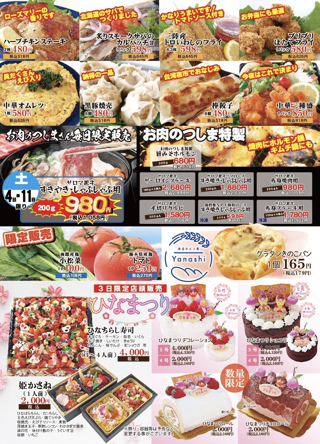 その他、バラエティ豊かなお惣菜や、「お肉のつしま」さんの美味しいお肉、新鮮な野菜などなど…
