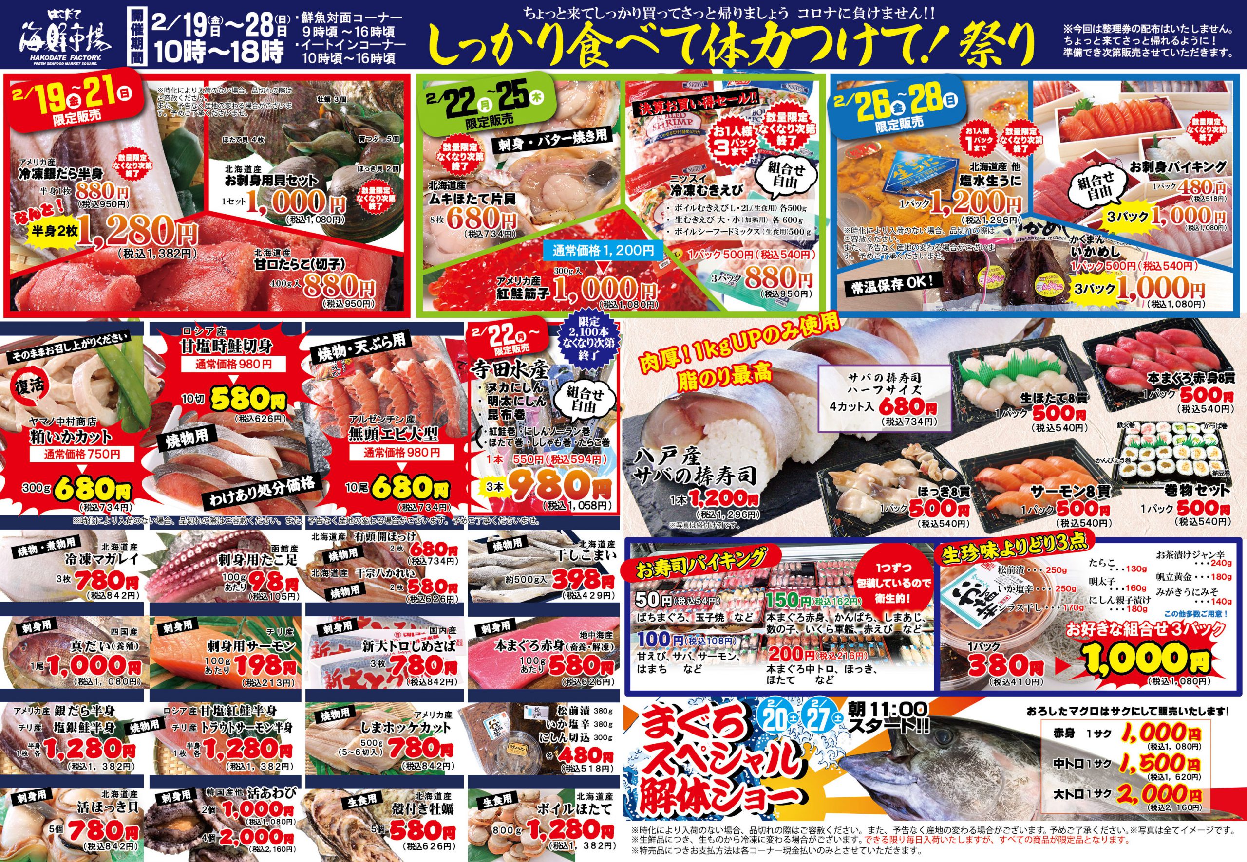 今回も活魚貝類やパック500円寿司は継続!